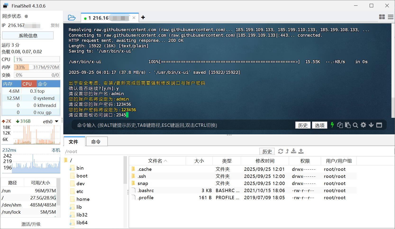 1.复制命令进行安装,安装过程耐心等待看到下面图片中出于安全考虑,安装/更新完成后需要强制修改端口与账户密码提示,这里只需要输入y,并且设置账号、密码、端口(建议设置4位数,单不能设置相同的4位数,例如6666这种,最好是错位数字)