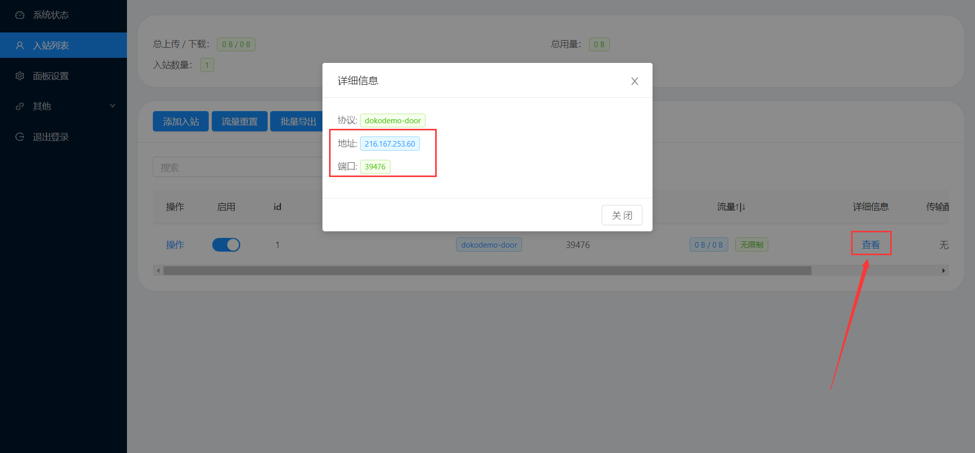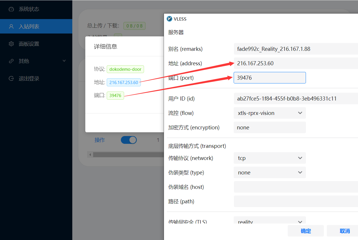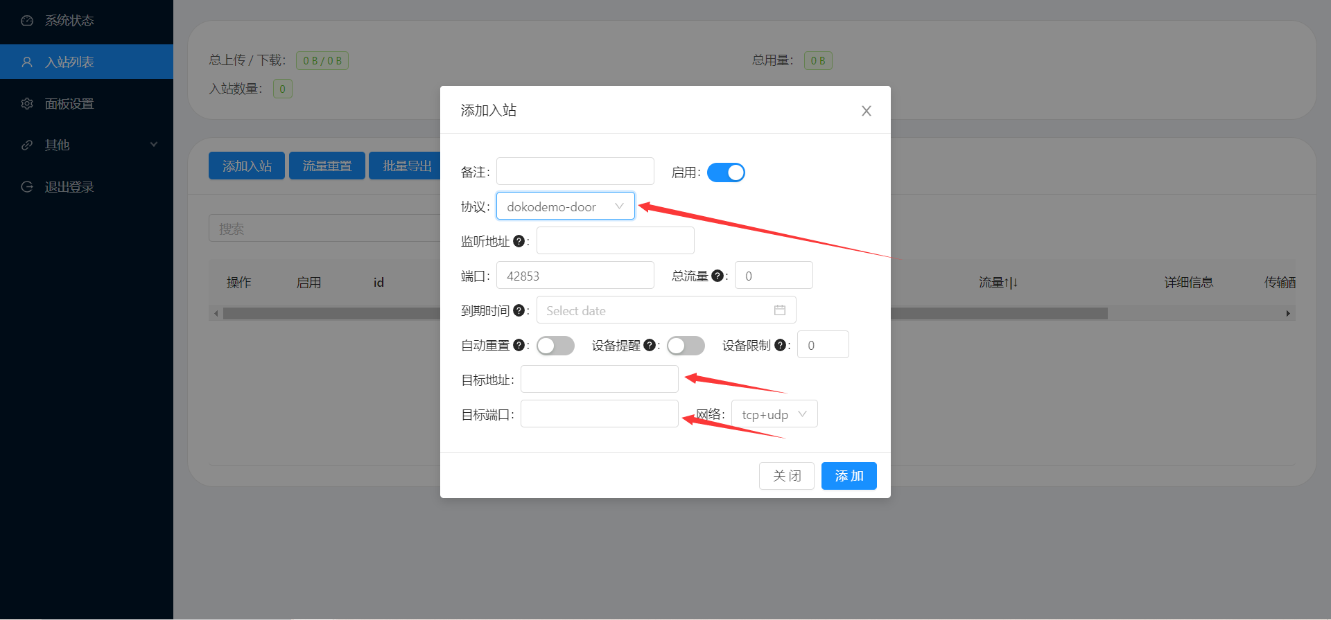 1.入站列表>添加入站>协议选择(dokodemo-door),然后其他的不用管,只需要在填写下面目标地址跟目标端口