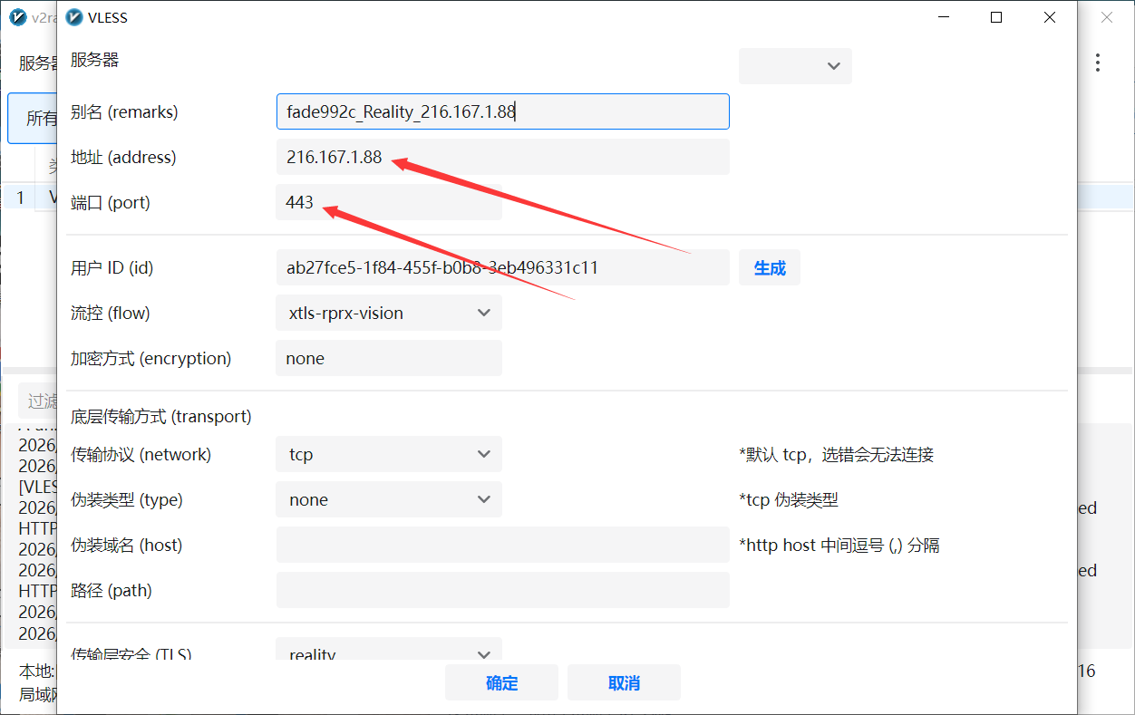 2.目标地址跟目标端口,就是我们当前使用的网络IP跟端口,举例如下,就用v2软件来讲,找到当前网络双击就可以到选中网络的信息编辑,只需要修改地址跟端口,其他信息都不修改(并非指定v2才可以,其他任何安卓/苹果的连接软件都一样原理,只需要编辑修改ip跟端口即可)