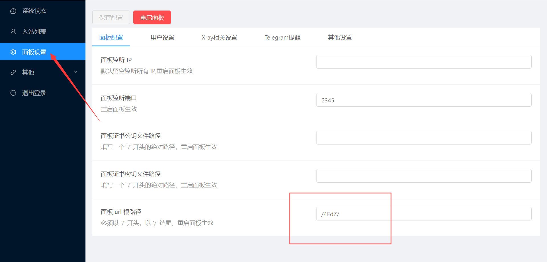 5.我们需要点击面板设置,他会自动给我们添加一个面板根路径 (这里注意,比如我们本来是访问IP:2345就可以进去,但是有了根路径之后,就需要访问IP:2345/根路径,否则访问会404)